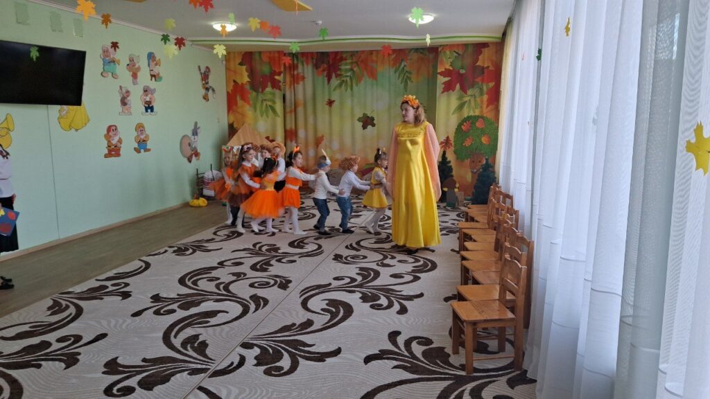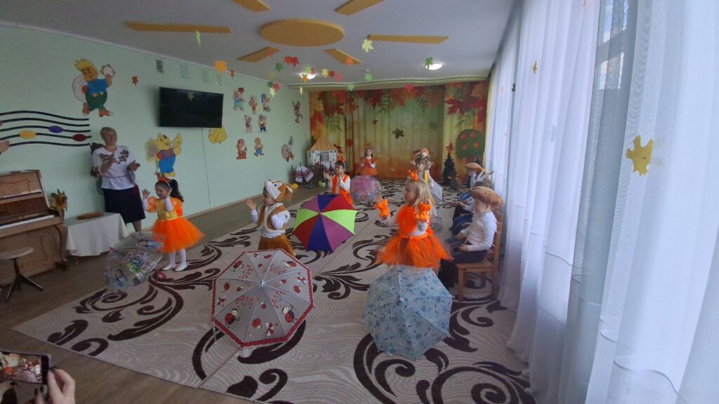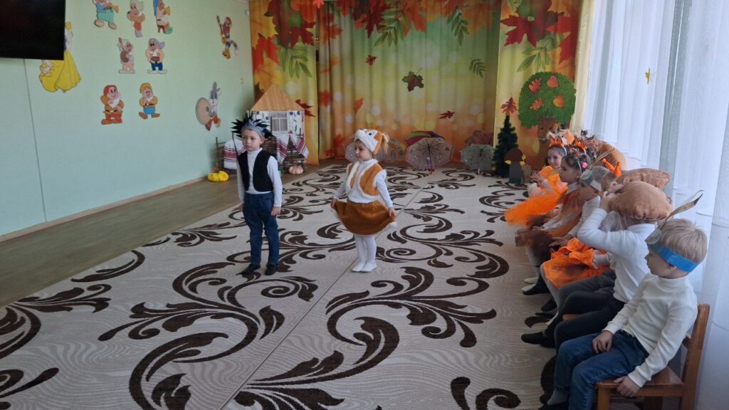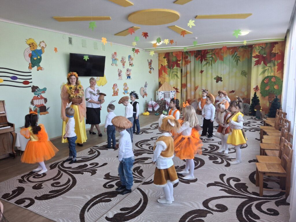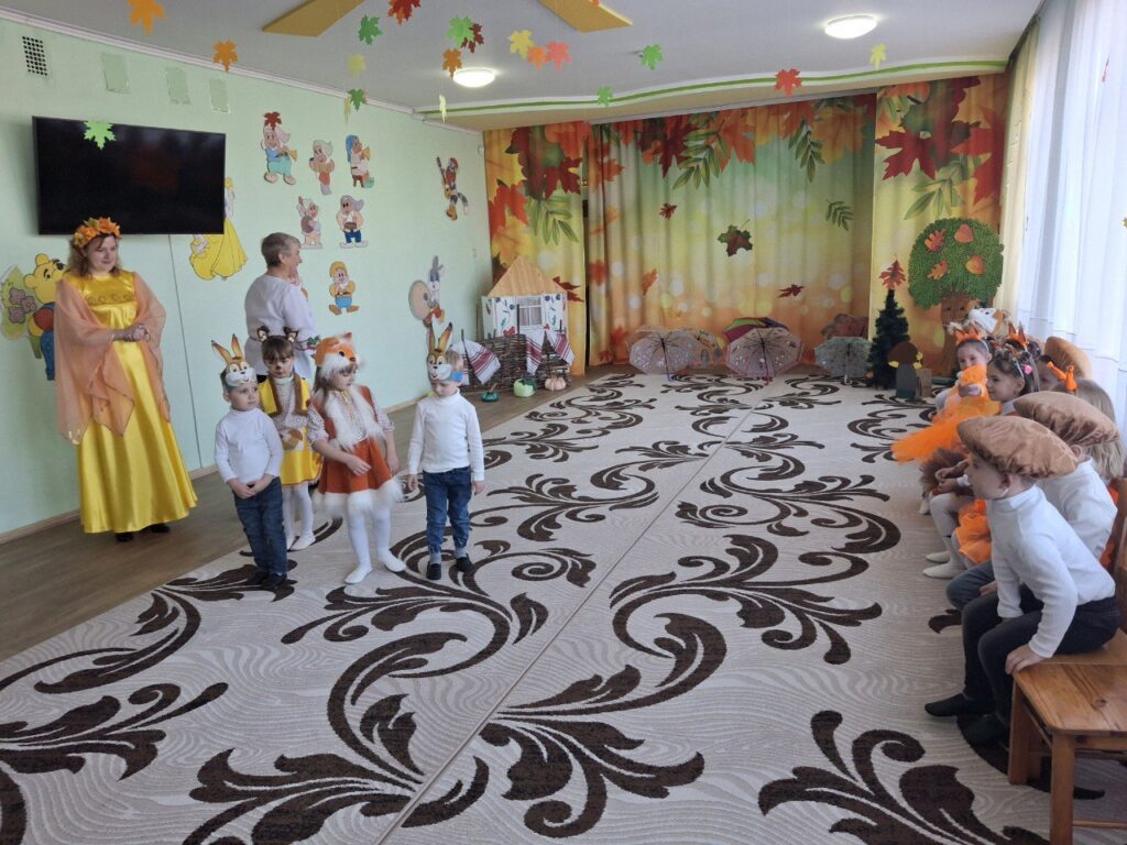 ” Осінь у нашому садочку-це не лише золоте листя під ногами,а й щирі усмішки наших вихованців.Осіннє свято ” Гостина в Їжачка” промайнуло, як одна яскрава миить:з піснями, танцями іграми та гостинцями.